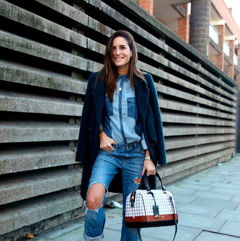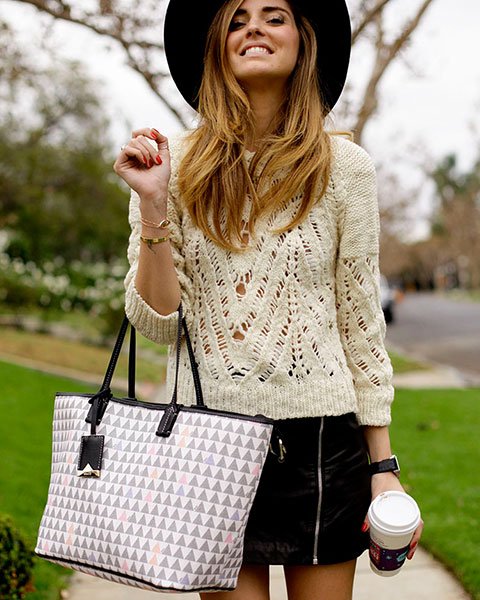 CHIARA FERRAGNI COMBINA SUA TRIANGLE NINA COM CHAPÉU FLAT E SWEATER DE TRICOT, FINALIZANDO COM JAQUETA E SAIA DE COURO. AH, O CAFÉ “TO GO” NÃO PODERIA FALTAR!