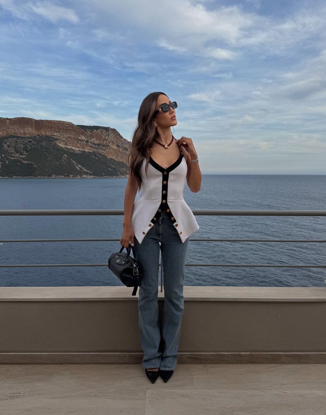O colete traz sofisticação imediata ao visual, enquanto a calça jeans equilibra a produção com um toque casual chic, ideal para o dia a dia. Os acessórios e o scarpin finalizam com elegância e atitude, funcionando do trabalho ao pós-expediente.