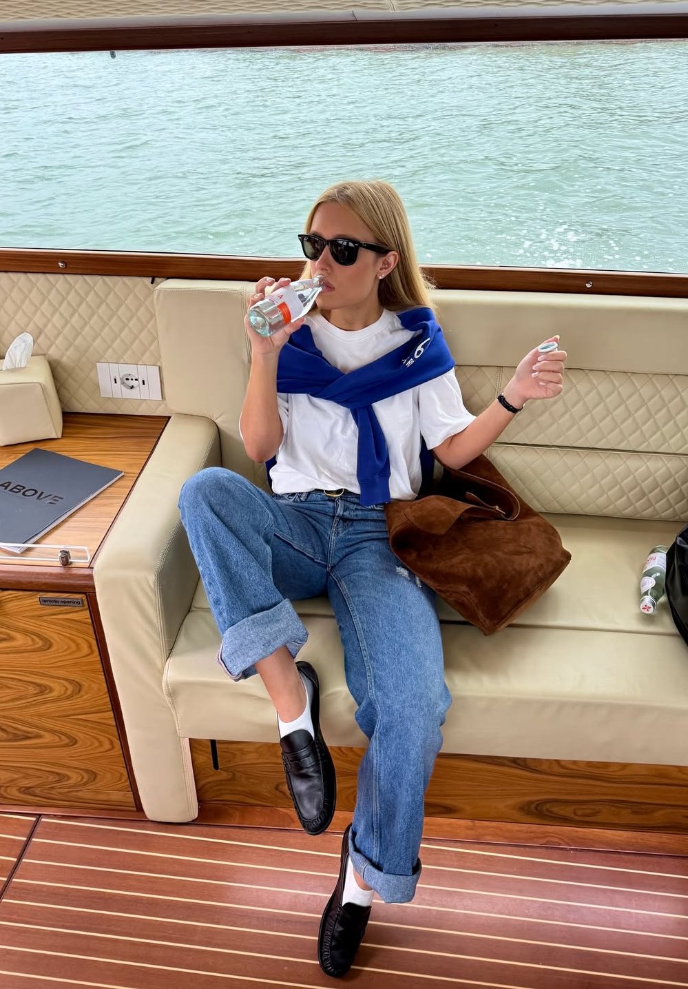 Calça jeans e t-shirt branca formam um combo atemporal e sempre elegante. O mocassim com meia adiciona um toque de styling moderno e cheio de personalidade, enquanto o suéter arremata o look com charme e ainda garante conforto extra para o ar-condicionado do escritório.
