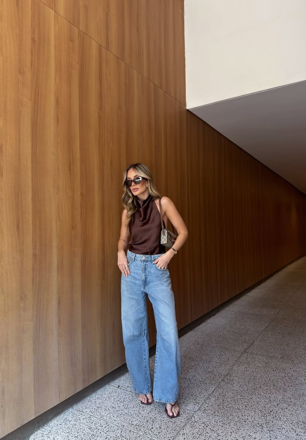 O top de gola alta em cetim adiciona sofisticação com seu brilho sutil, enquanto a calça jeans de modelagem ampla equilibra a produção com um mood casual e contemporâneo. A thong sandal finaliza com leveza e informação de moda, deixando o look atual e descomplicado.