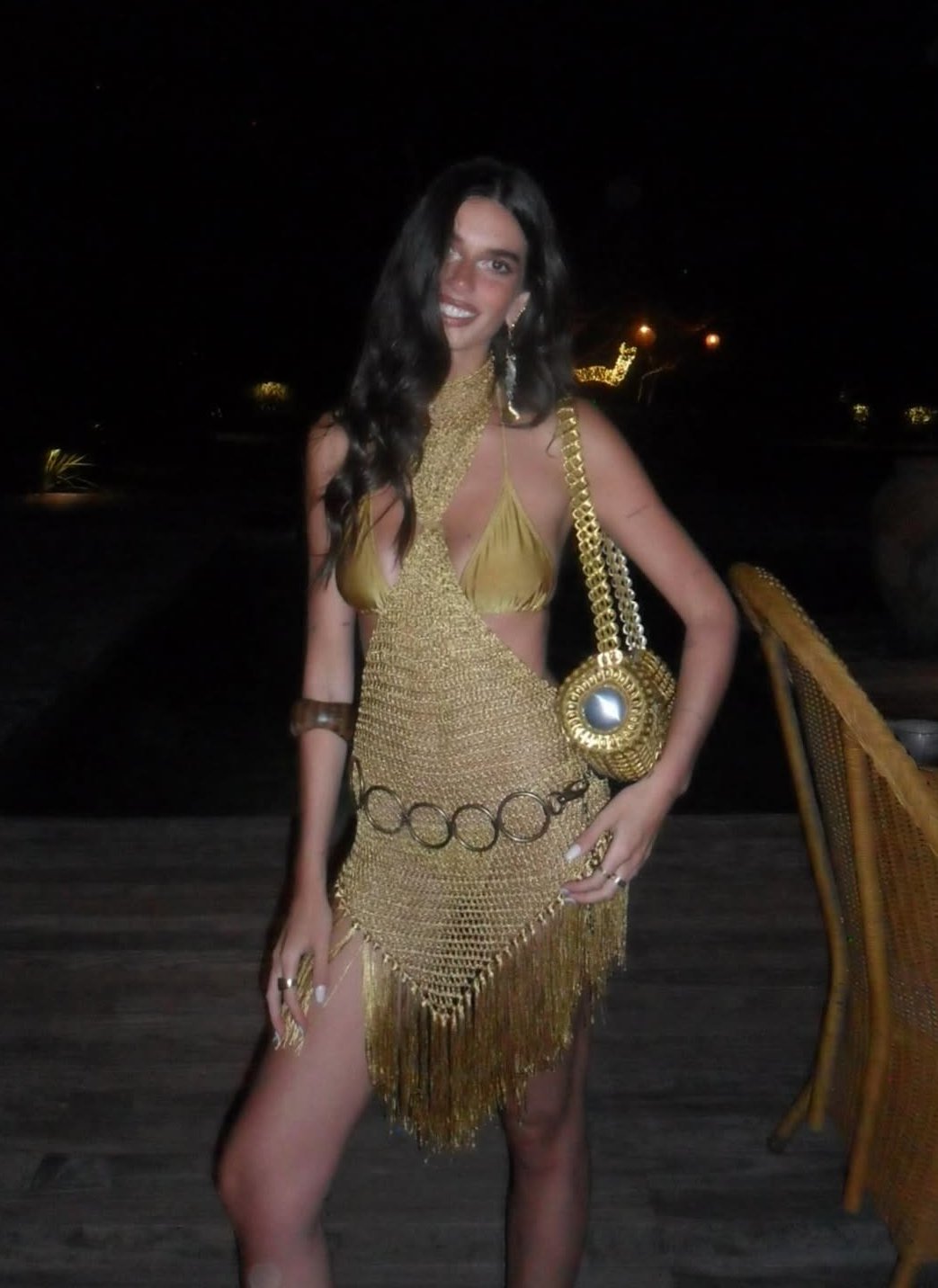 O dourado domina a produção e imprime um efeito luxuoso e poderoso. A textura metálica com franjas cria movimento a cada passo, enquanto os recortes estratégicos reforçam uma estética glam, perfeita para quem quer ser o destaque da noite.