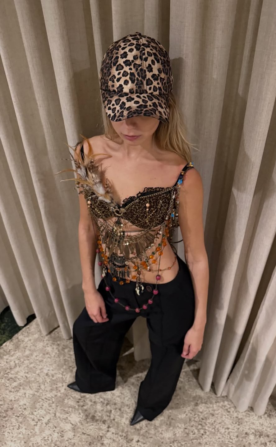 A estética boho aparece em uma leitura urbana e atual, com top de inspiração artesanal e aplicações que criam movimento. O contraste com a calça de alfaiataria traz equilíbrio ao visual, resultando em uma produção cheia de personalidade para o Carnaval.