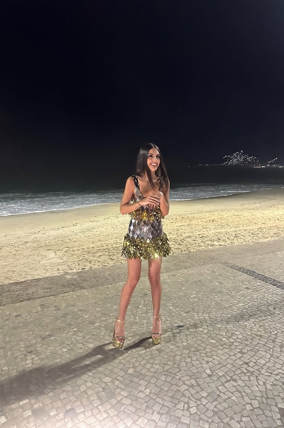 O vestido curto com aplicações metalizadas traz brilho na medida certa para produções noturnas à beira da praia. A silhueta leve e o acabamento reluzente criam um visual fresh, elegante e ideal para quem busca impacto sem abrir mão da fluidez.