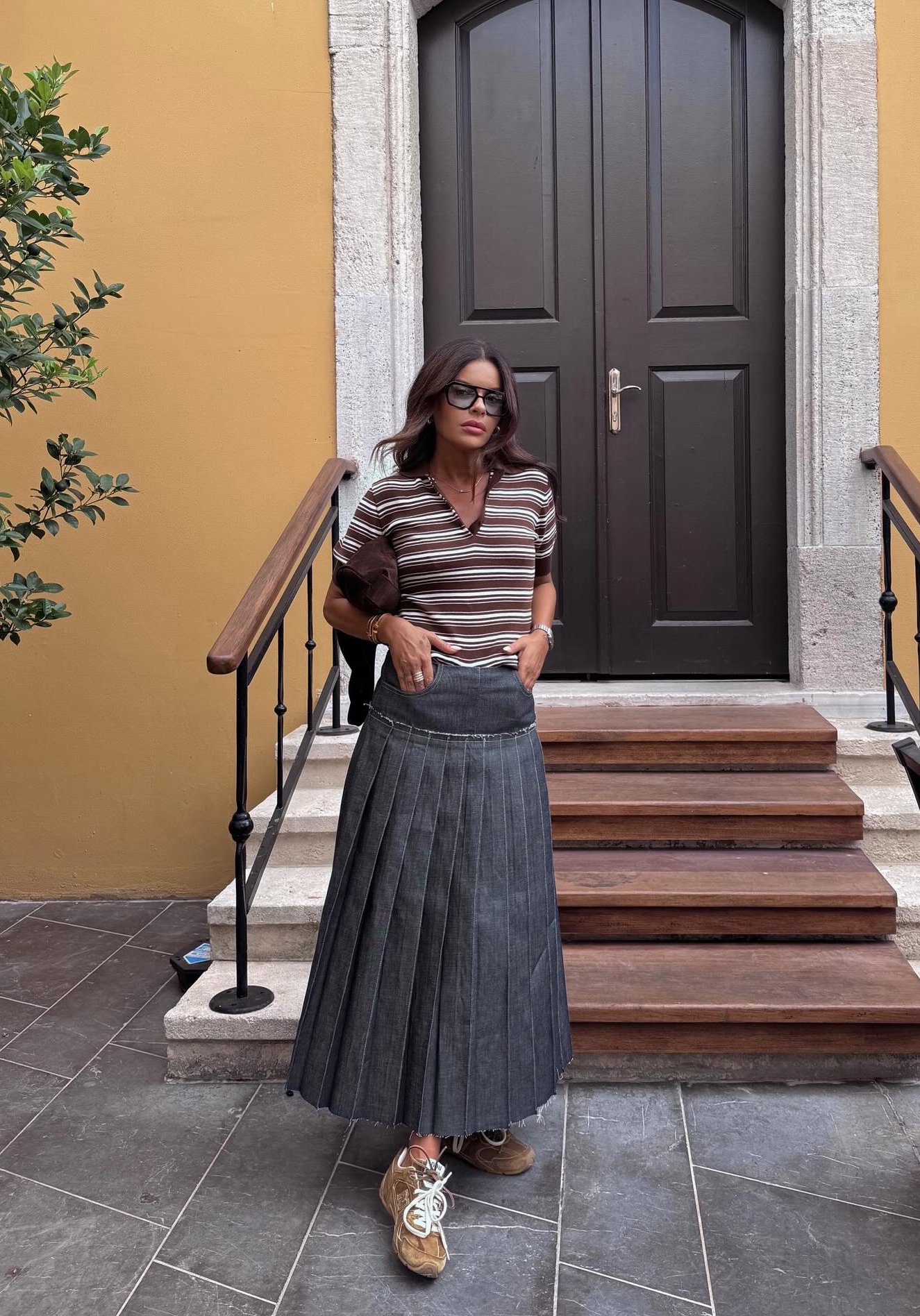 Um look fashionista com toque retrô. A saia longa plissada em jeans traz elegância e movimento, enquanto a blusa listrada adiciona charme vintage à produção. O tênis marrom arremata o visual com conforto e autenticidade, perfeito para o dia a dia com estilo.