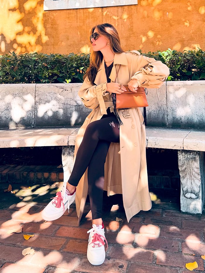 A combinação perfeita entre casual e chic. O trench coat clássico ganha leveza ao ser usado com legging e tênis colorido, criando um contraste moderno e elegante. Um look ideal para dias corridos, mantendo o conforto e o estilo em alta.