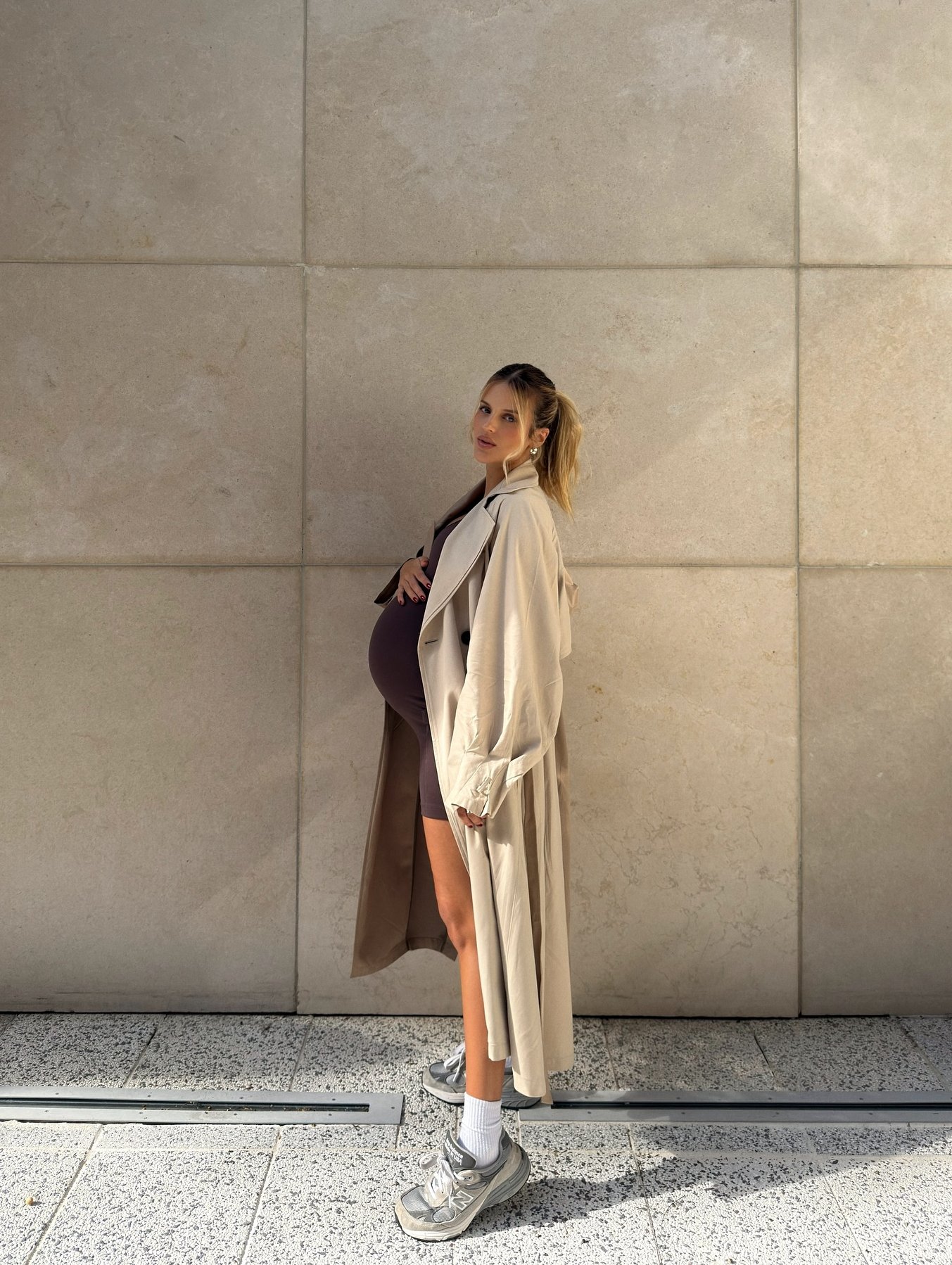 Um mix perfeito entre elegância e conforto. O trench coat alongado traz sofisticação ao look com vestido justo e tênis esportivo. A combinação é moderna, prática e cheia de personalidade — ideal para quem ama estilo sem abrir mão do bem-estar.