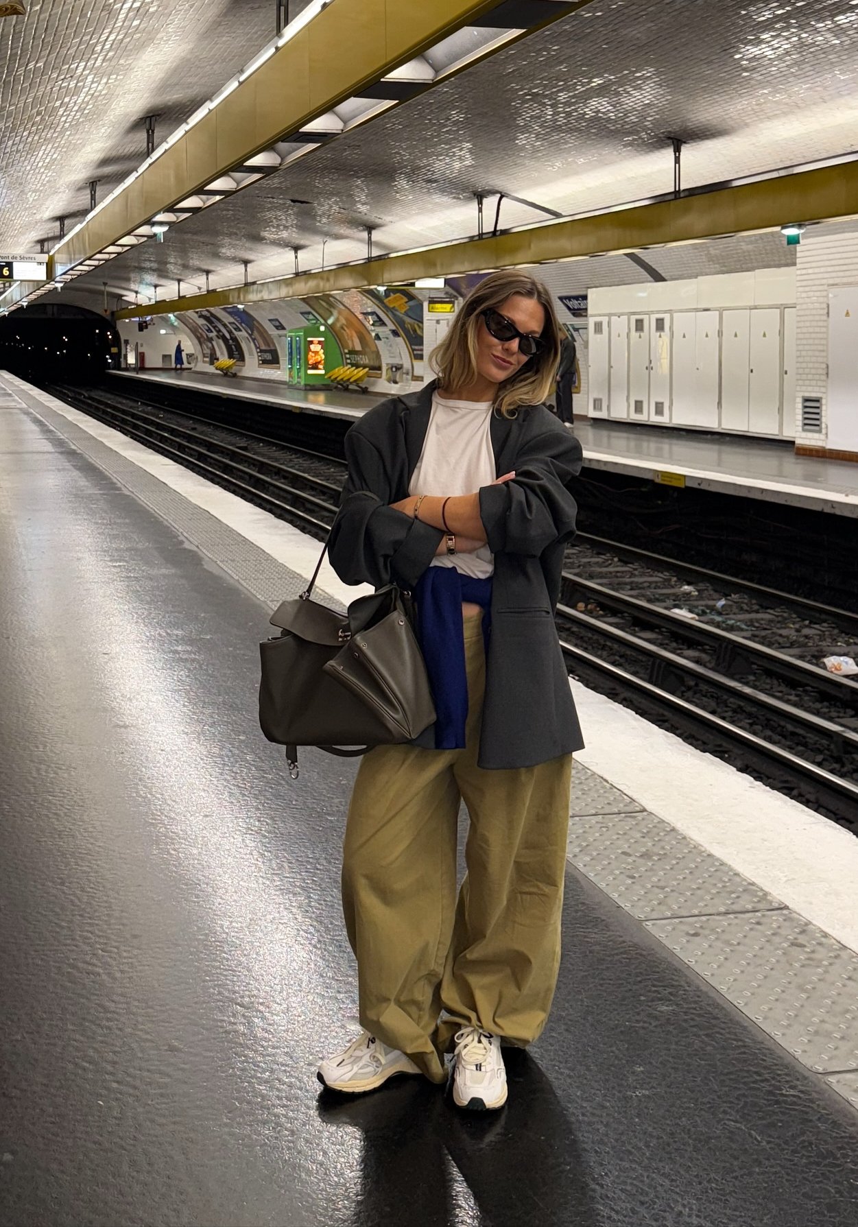 Um visual effortless com toque urbano. A combinação de calça ampla, t-shirt básica e blazer oversized cria um equilíbrio perfeito entre conforto e sofisticação. O tênis branco finaliza o look com aquela pegada cool e prática para o dia a dia.