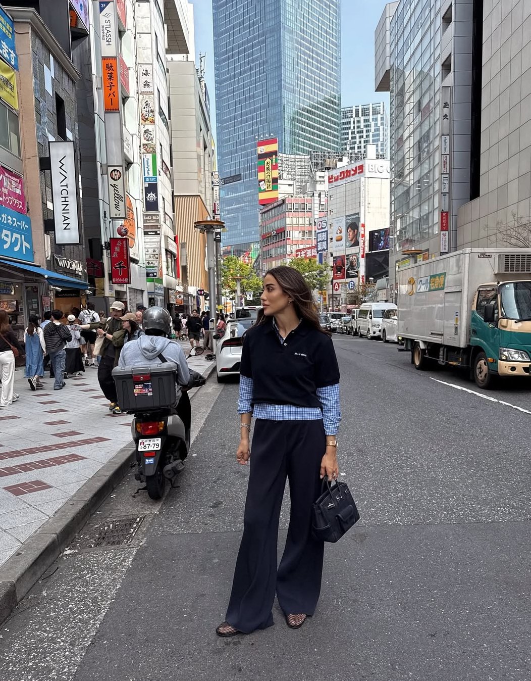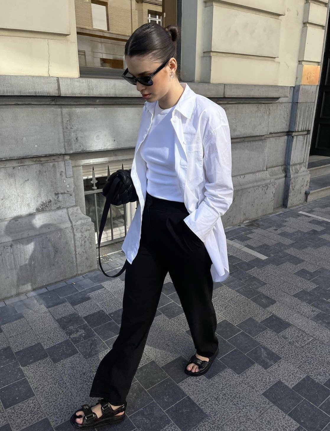 A regata com camisa aberta cria uma sobreposição leve, combinada à calça de alfaiataria para um visual mais alinhado. Um mix que transita entre o casual e o sofisticado.