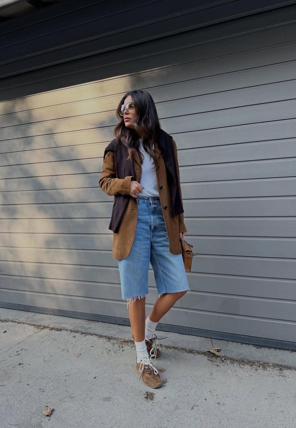 O blazer estruturado combinado ao shorts cria um contraste interessante entre alfaiataria e leveza. Ideal para composições versáteis.