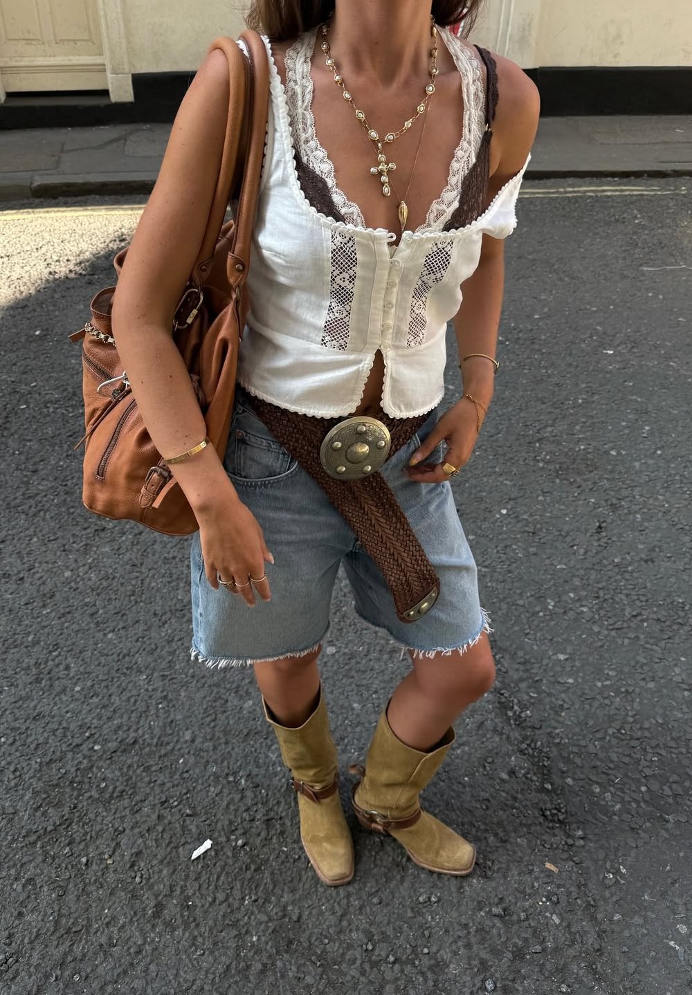 A bermuda jeans aparece como alternativa ao jeans tradicional. Com a bota, o look ganha peso e um visual mais atual.