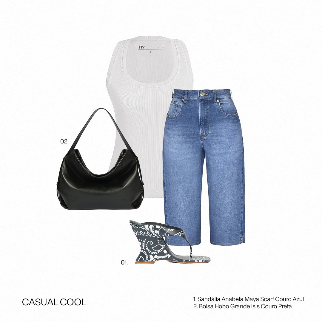 A regata off white e o jeans corsário criam uma base cool e effortless, enquanto a anabela estampada e a bolsa preta adicionam um toque fashion e urbano à produção.