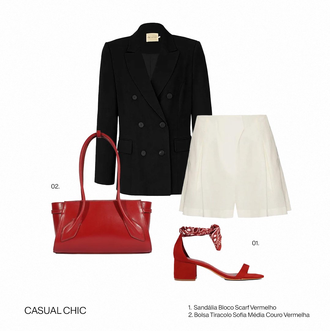 Este casual chic usa a alfaiataria clássica do blazer e shorts para um visual poderoso. O toque de tendência é garantido pela sandália de bloco com lenço, que moderniza a produção, e pela bolsa vermelha.