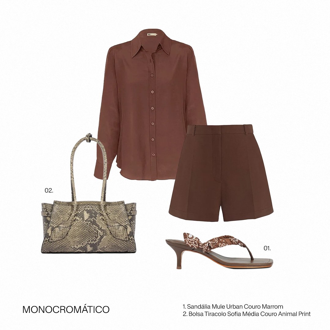 O monocromático em tons terrosos exala sofisticação e conforto. A bolsa com estampa de cobra e a sandália com lenço são a chave para injetar personalidade e um ponto de alta tendência.