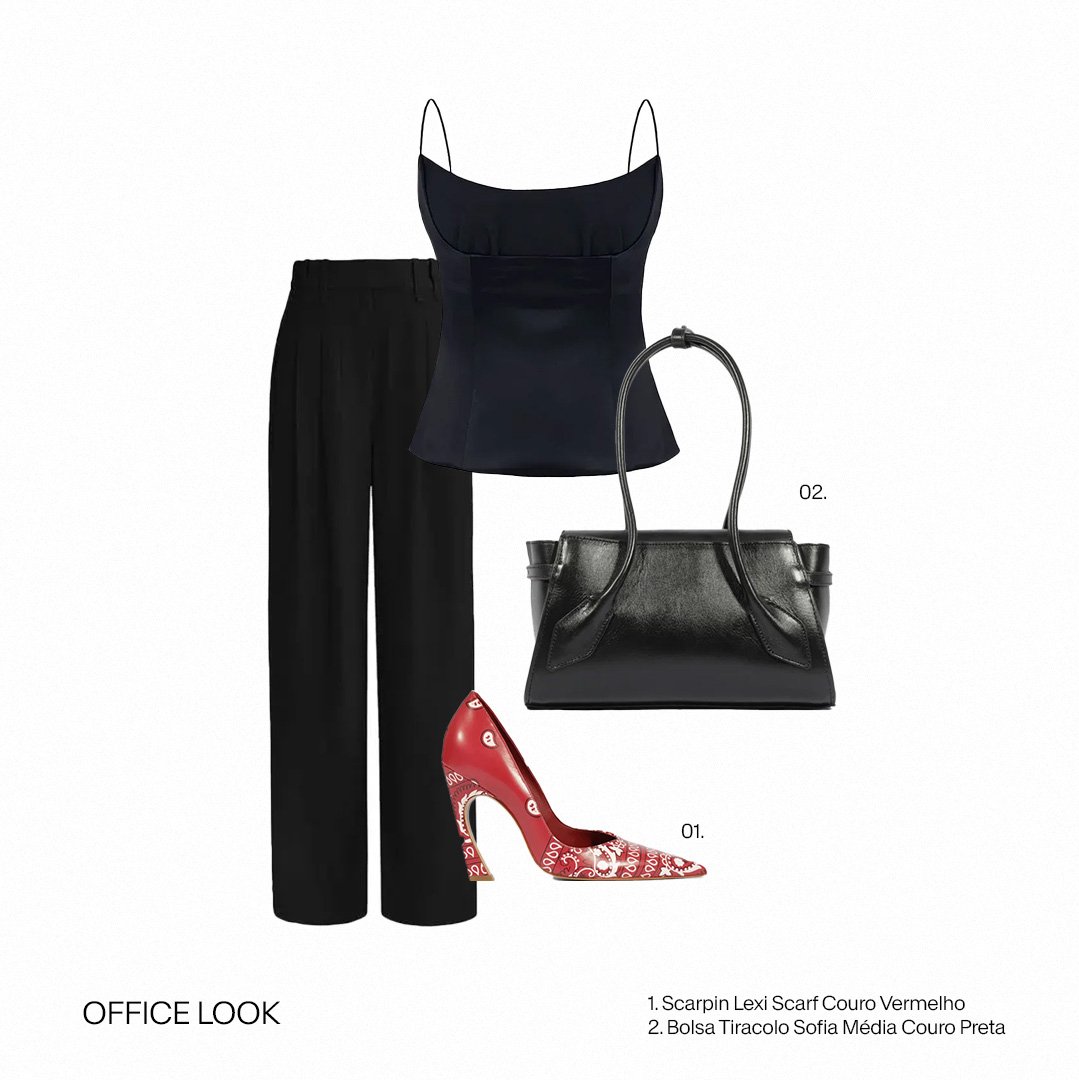 O all black é a base elegante e minimalista, ganhando força com o scarpin estampado em vermelho. O contraste cria um visual moderno e sofisticado, ideal para unir estilo e atitude.